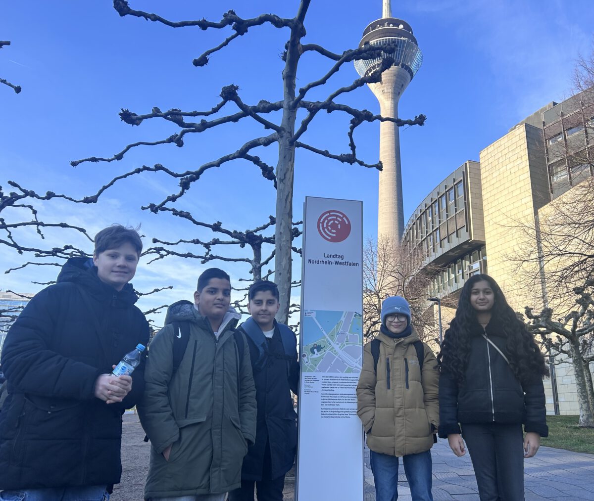 Alina Zamil, Soheil Ahmad, Danish Baig und Mohammad Achakzai aus der 6a sowie Simon Köln aus der 7b machten sich gemeinsam mit ihrer Lehrerin Frau Walker-Sellmeier auf den Weg nach Düsseldorf. Ziel: der Landtag Nordrhein-Westfalen.